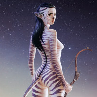 desert setting, with a backdrop that could be interpreted as either stars or some sort of technological or magical portal. She has the upper body of a human and the lower body of a zebra, which suggests she might be a character from