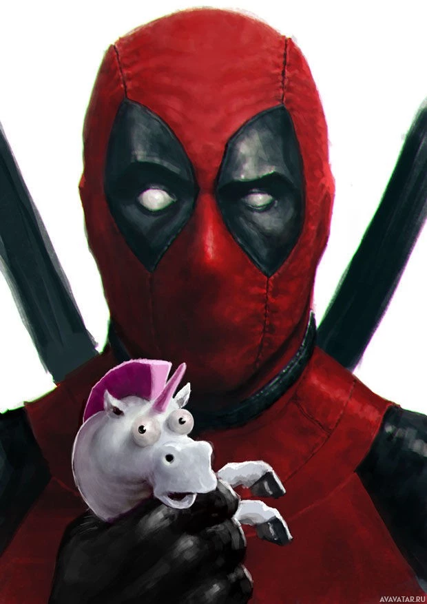 pink hair, which appears to be part of the Deadpool comics or series. The background is plain, focusing attention on the interaction between Deadpool and the unicorn.