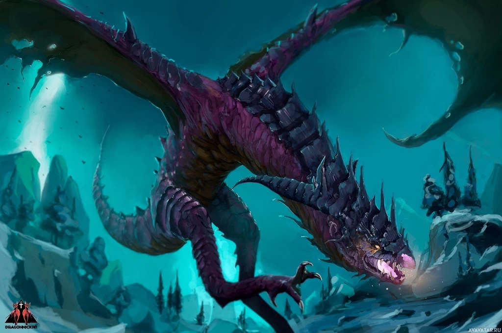 Это образ фантастического дракона. Дракон имеет фиолетовый оттенок и изображен в динамической позе, предполагающей движение или действие. Он расположен на фоне ледяного пейзажа или замороженной тундры, которая дополняет фантастическую тему изображения.