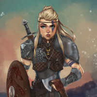 blonde hair and is depicted wearing armor that suggests she might be a warrior or fighter from a fantasy setting. Her attire includes a helmet, chest plate with