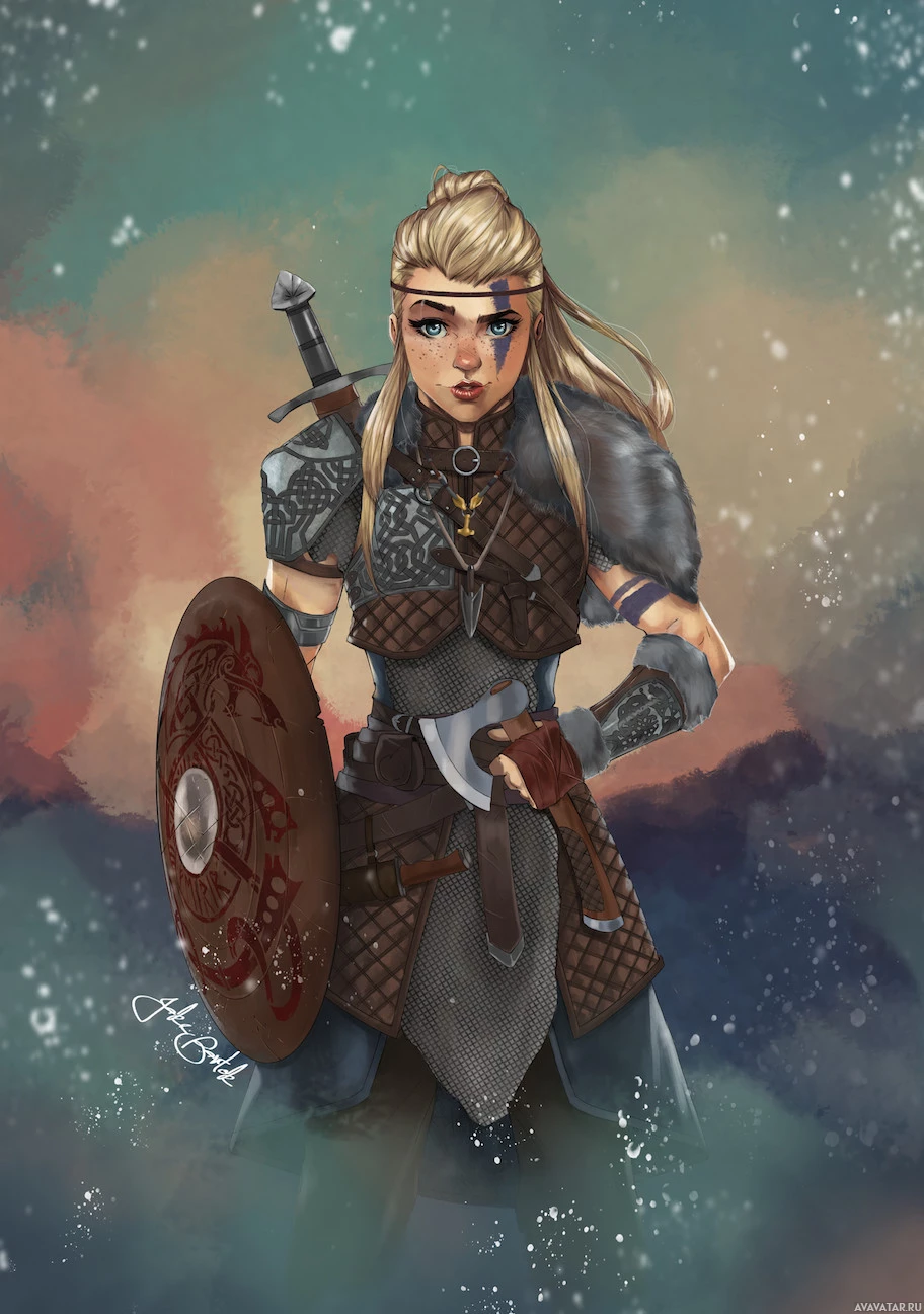 intricate designs, and she is holding a shield emblazoned with what appears to be a runic symbol. She also has a sword at her side and is wearing armor that looks like it's made of