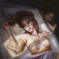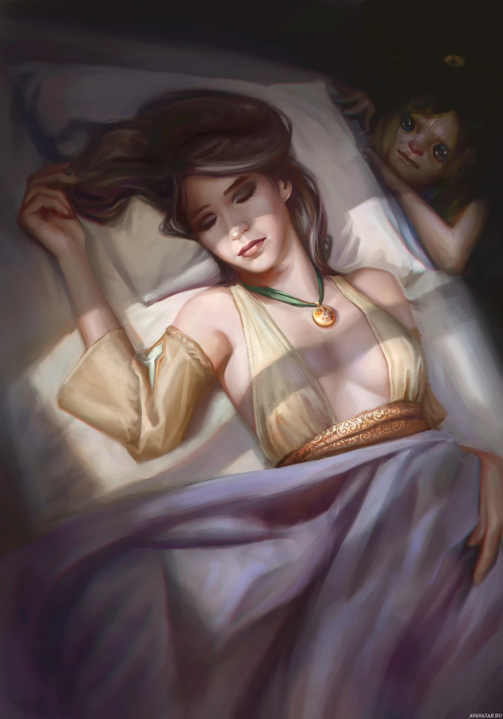 the video game "The Witcher" lying on her back in bed. She is dressed in what appears to be an outfit suitable for her character, suggesting she might be portrayed as a witch or sorceress within the context of the game's universe. There is another character in the image, looking at her with