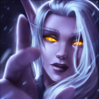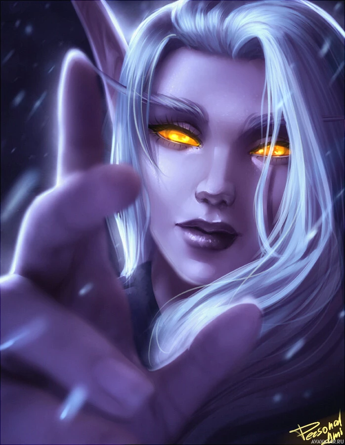 fantasy settings. She also has striking yellow eyes, which could indicate she is a drow, a race of dark elves from D&D known for their distinctive appearance, including skin color ranging from grey to dark purple and bright
