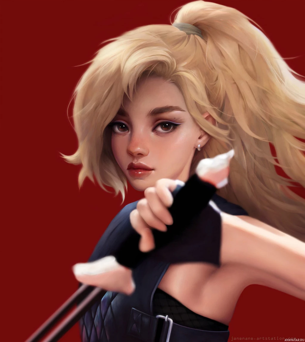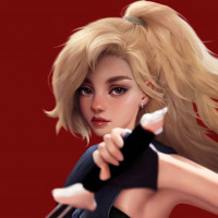 blonde hair and is depicted with a confident pose, holding what appears to be a weapon in each hand. Her attire suggests she might be a warrior or someone involved in