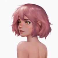 yellow color. Her skin is pale and she appears to be naked from the waist up. The background is plain, which brings focus to the character herself. The overall style suggests it could be inspired by anime or manga art.