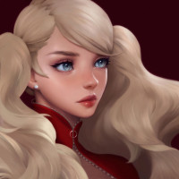 blue eyes and is wearing what seems to be a red outfit with some sort of emblem or crest on it. Her expression is neutral, and she has a very detailed design indicative of modern animation styles.