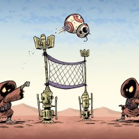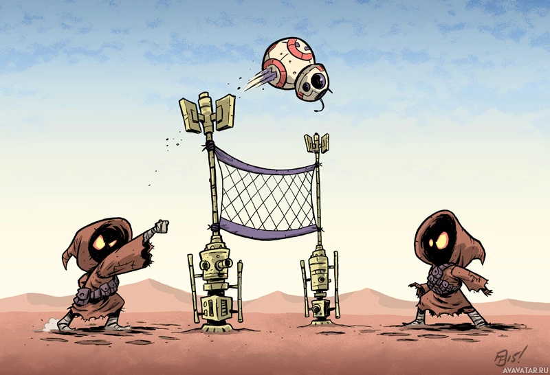 the Star Wars franchise engaged in a game of volleyball on a desert planet. On one side, there is BB-8, a small droid with orange and