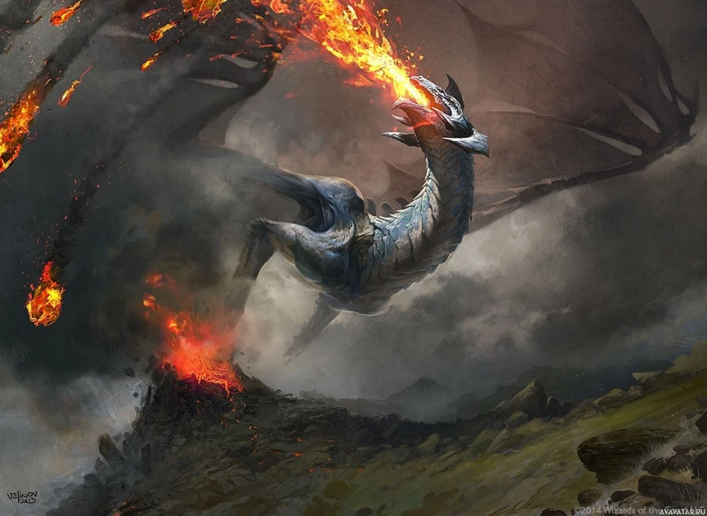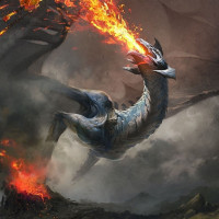 a fantasy scene featuring a dragon. The dragon is shown with flames emanating from its mouth, and it appears to be in flight over a rocky landscape that seems to be in distress, possibly due to the fire