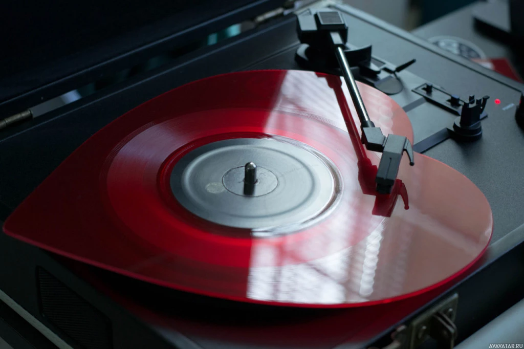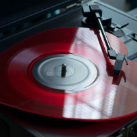 vinyl records in place. One can see the needle resting on top of the record, indicating that it has just started to play or is about to begin playing. There is no visible