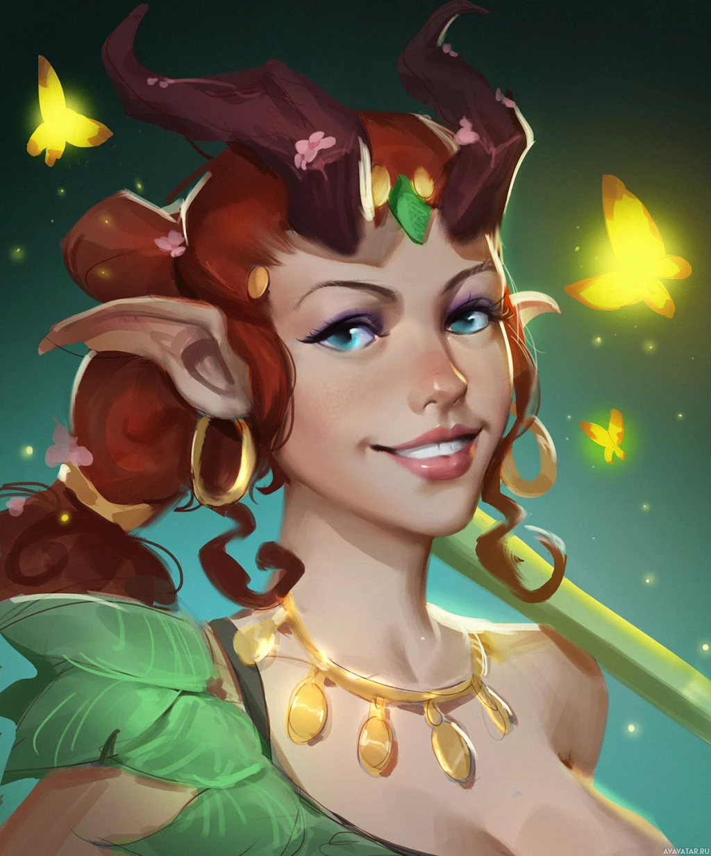 an enchanted staff or wand. Butterflies are floating around her head, and there are