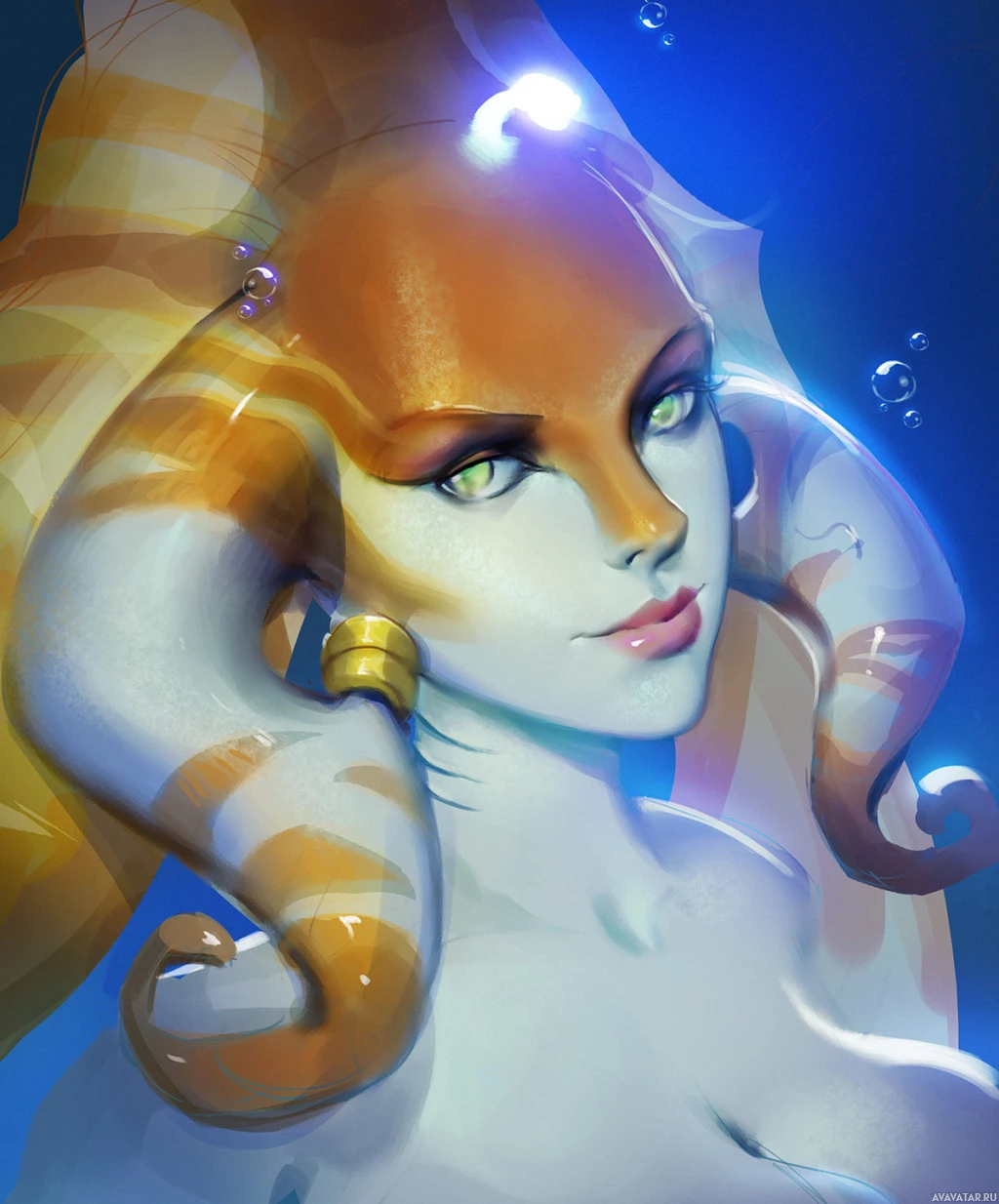 This image features an animated character that appears to be a version of Naga Siren from
