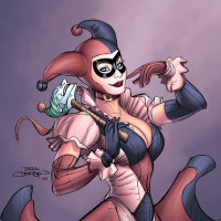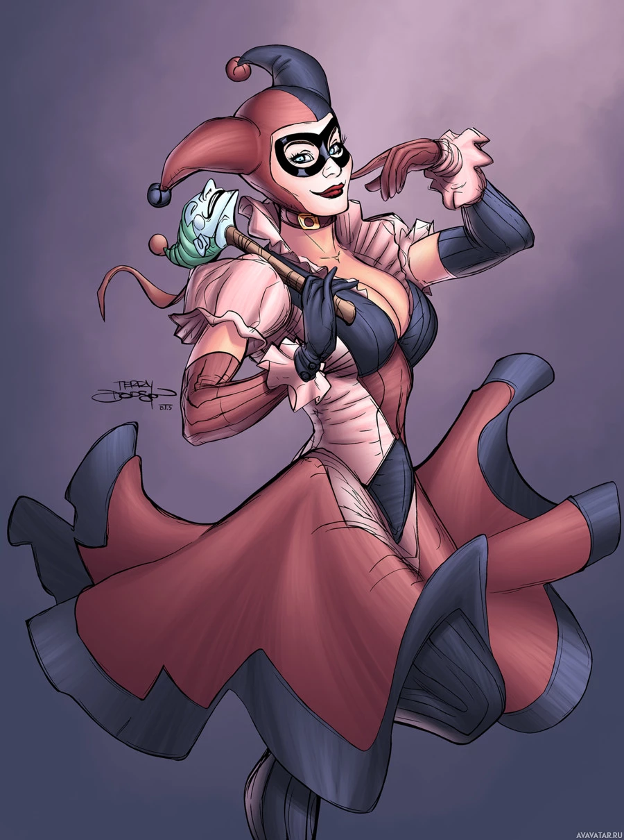 a female character who appears to be Harley Quinn from the Batman universe. She is depicted in her iconic costume, which includes a red and black outfit with ruffles and frills, a corset-style top, a mask covering half her face, and holding what seems to be a baseball bat with a fish symbol on it, which is characteristic of