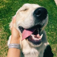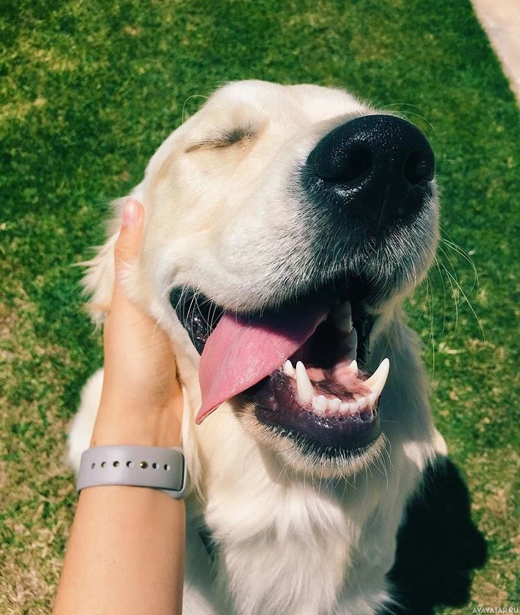 На картинке изображена золотая собака-ретривер с высунутым языком, которая, кажется, наслаждается собой. Видна человеческая рука, ласкающая собаку на спине. Обстановка, по-видимому, представляет собой открытую площадку с травой и некоторыми деревьями на заднем плане, предполагая, что это может быть парк или аналогичное пространство для отдыха.