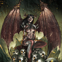 large wings and is seated on a throne with numerous human skulls at its base, suggesting she holds some form of power or authority over death. The artwork is rich in detail, with dark tones and a dramatic atmosphere, which fits well within