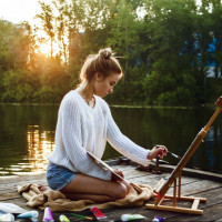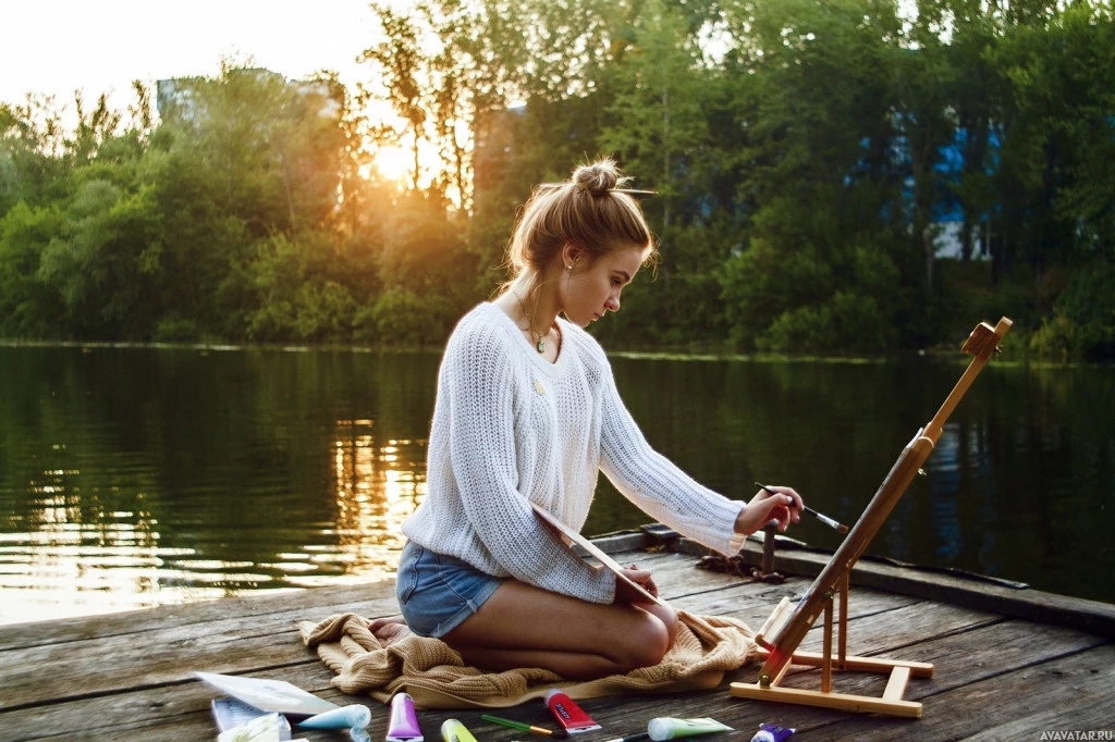 The picture shows a woman who appears to be engaging in a painting activity. She is sitting on what looks like an Easel, which suggests she might be drawing or painting. The setting appears serene and peaceful, with