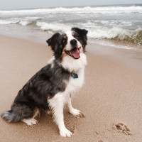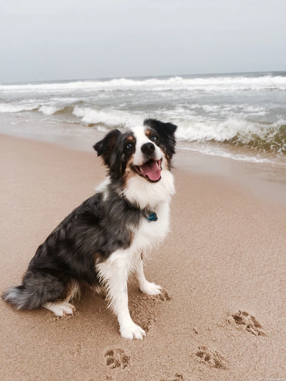 a seaside location. The dog appears to be a happy and energetic breed with white, black, and brown markings, possibly