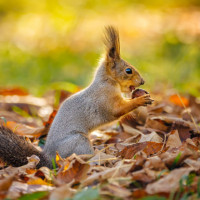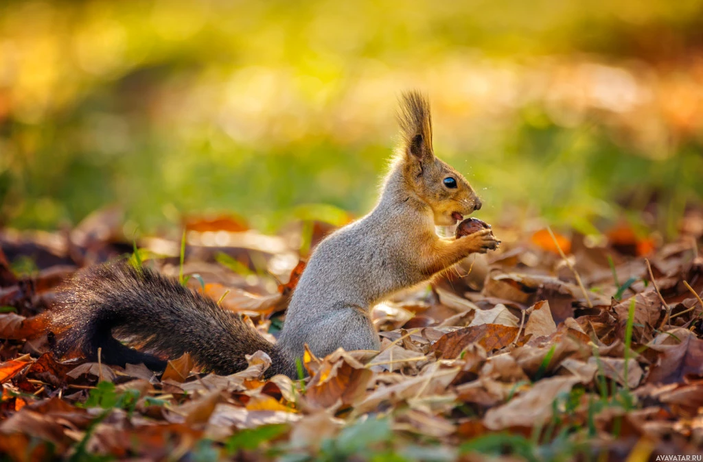 The picture shows a squirrel in the foreground, seemingly eating something off the ground. The background features an autumn scene with