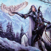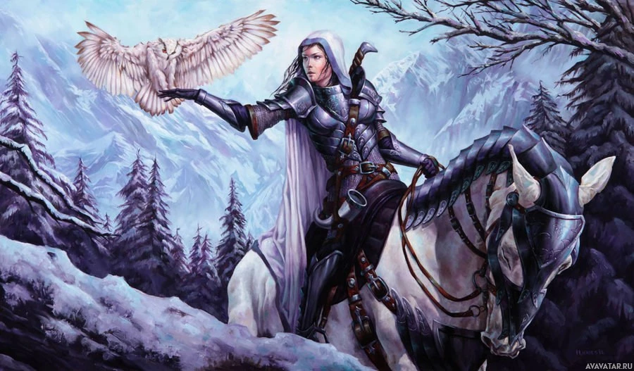a large owl, perched on their hand. The background shows snow-covered mountains, indicating