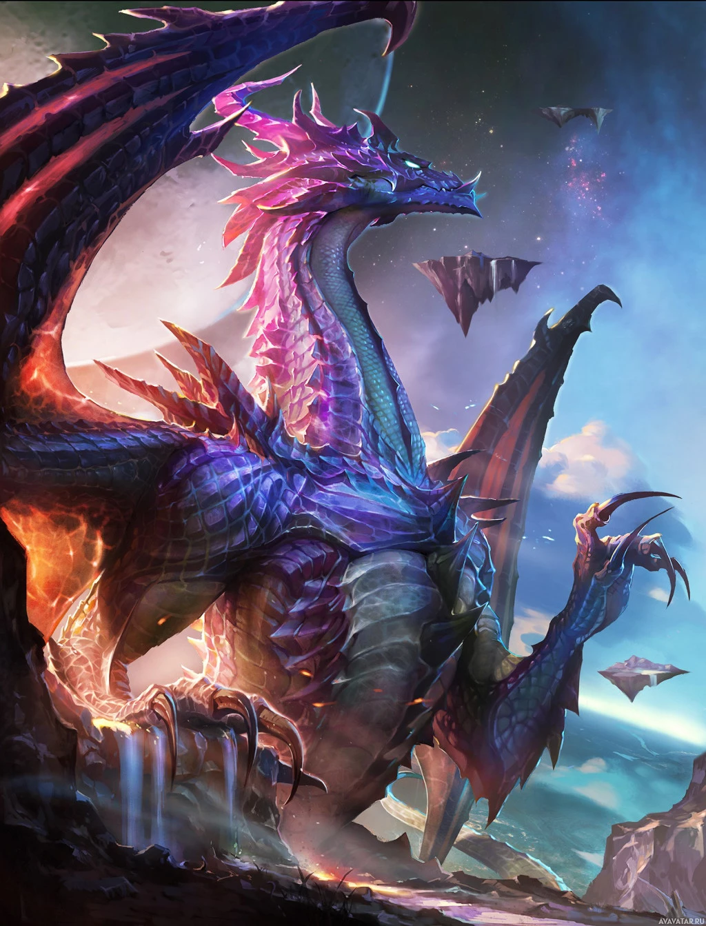 vibrant colors and intricate patterns on its scales, with a combination of purple, blue, and pink hues. It appears to be set in a magical or otherworldly environment, possibly within