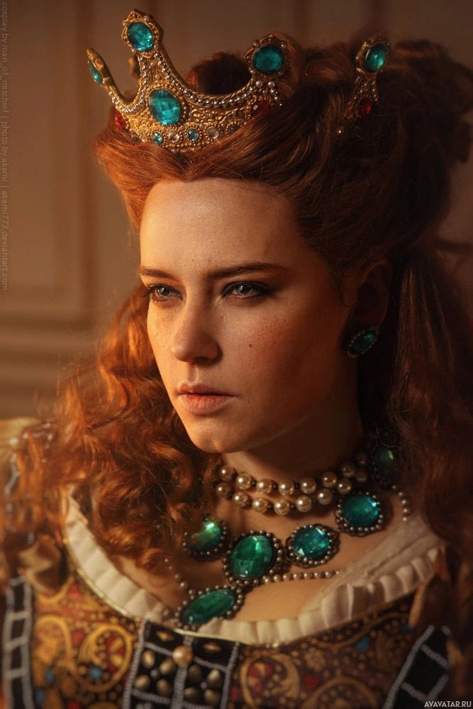 period clothing with ornate jewelry that includes a crown, necklaces, and other decorative items. Their expression is neutral, and they have