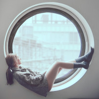 long hair, seated in a small round window. She appears to be looking out of the window with