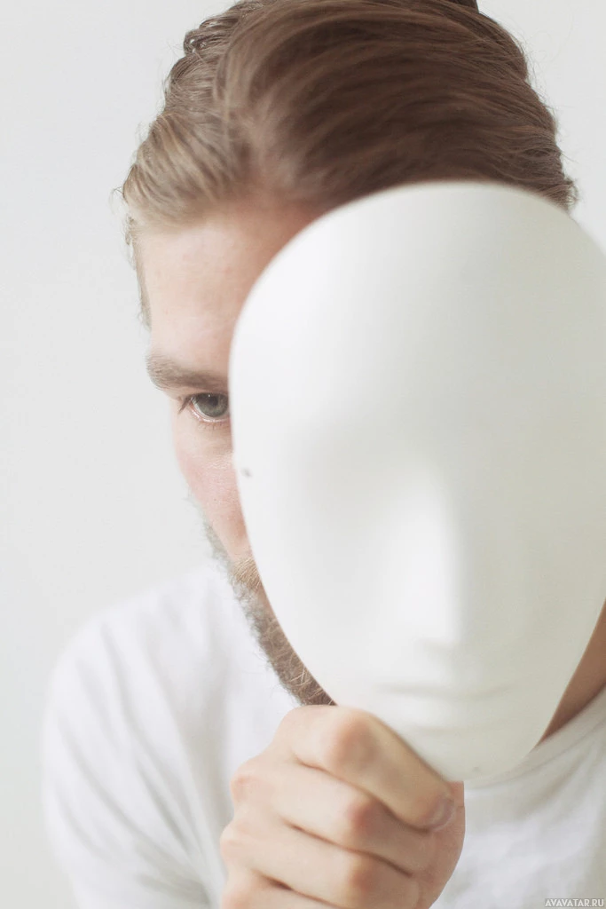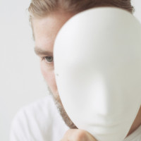 a white mask or dummy head. He appears to be examining the mask closely, with his face partially obscured by it. The background is neutral in color, providing a contrast that highlights the subject and the mask he's holding. There is