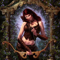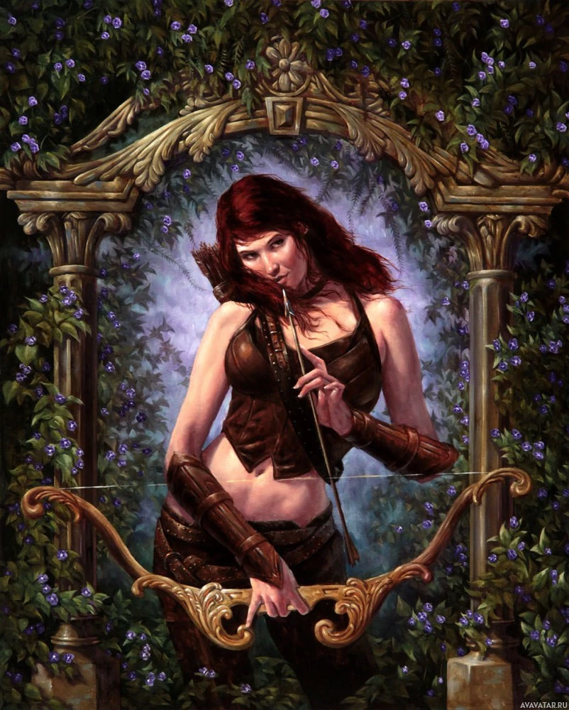 red hair and is wearing a corset with leather armor, suggesting she might be a warrior or archer. In her hands, she holds a bow, indicating that she is armed for combat or hunting. Behind her, there's an ornate frame with