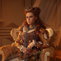 The image depicts a person dressed in elaborate historical or fantasy-style costume, reminiscent of 16th or