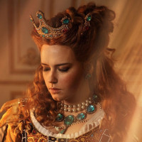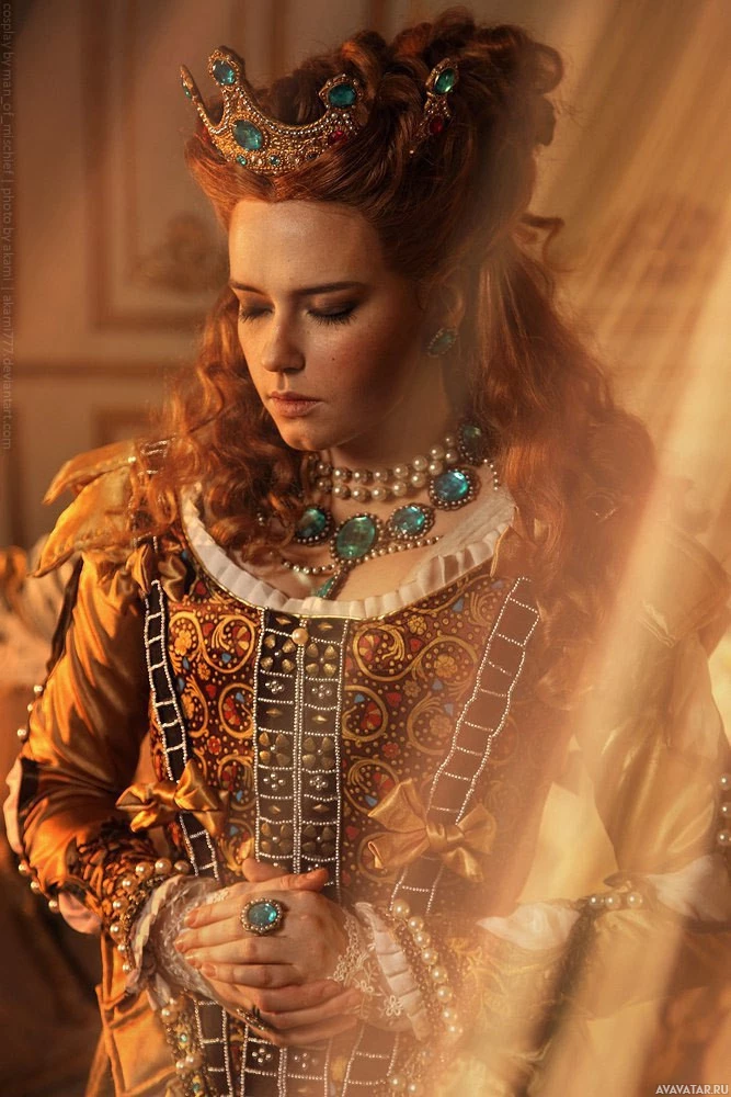 period costume, likely inspired by the attire from historical or fantasy settings. She has long