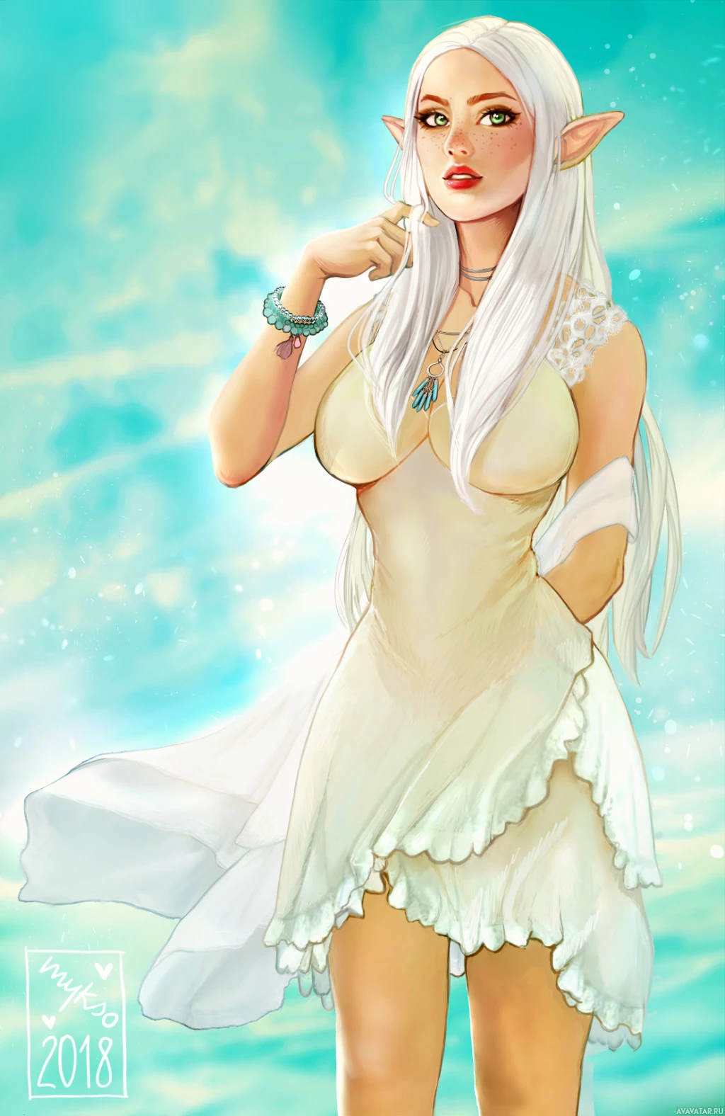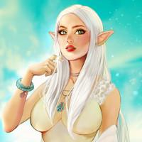white hair, pointed ears characteristic of elves in fantasy genres, and is wearing an elegant dress with intricate patterns. The background suggests a serene and magical environment, fitting the fantasy theme.