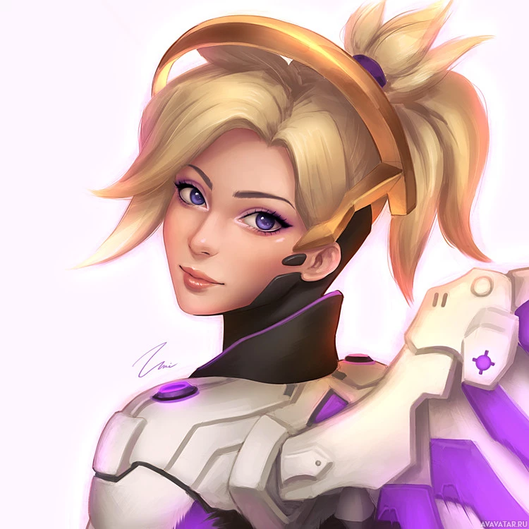 the video game Overwatch. She is depicted wearing her signature armor with a purple and white color scheme, which includes a helmet with a visor, a chest piece with a purple glowing heart emblem, and shoulder pieces with