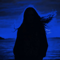 a reflection of light that seems to be coming from the horizon or possibly artificial lights in the distance. The person's hair is blowing slightly due to a breeze, suggesting