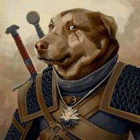 human armor with the appearance of a knight. The armor includes chainmail, a helmet, and a sword at its side. The dog is looking to the left with an expression that could be interpreted as serious or attentive. There's also a small badge on the dog's collar that resembles