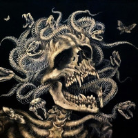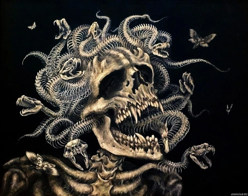 The image features a skeleton with a snake wrapped around its neck and head. In front of the skull, there appears to be another snake that is reaching towards its mouth. There are also two
