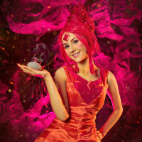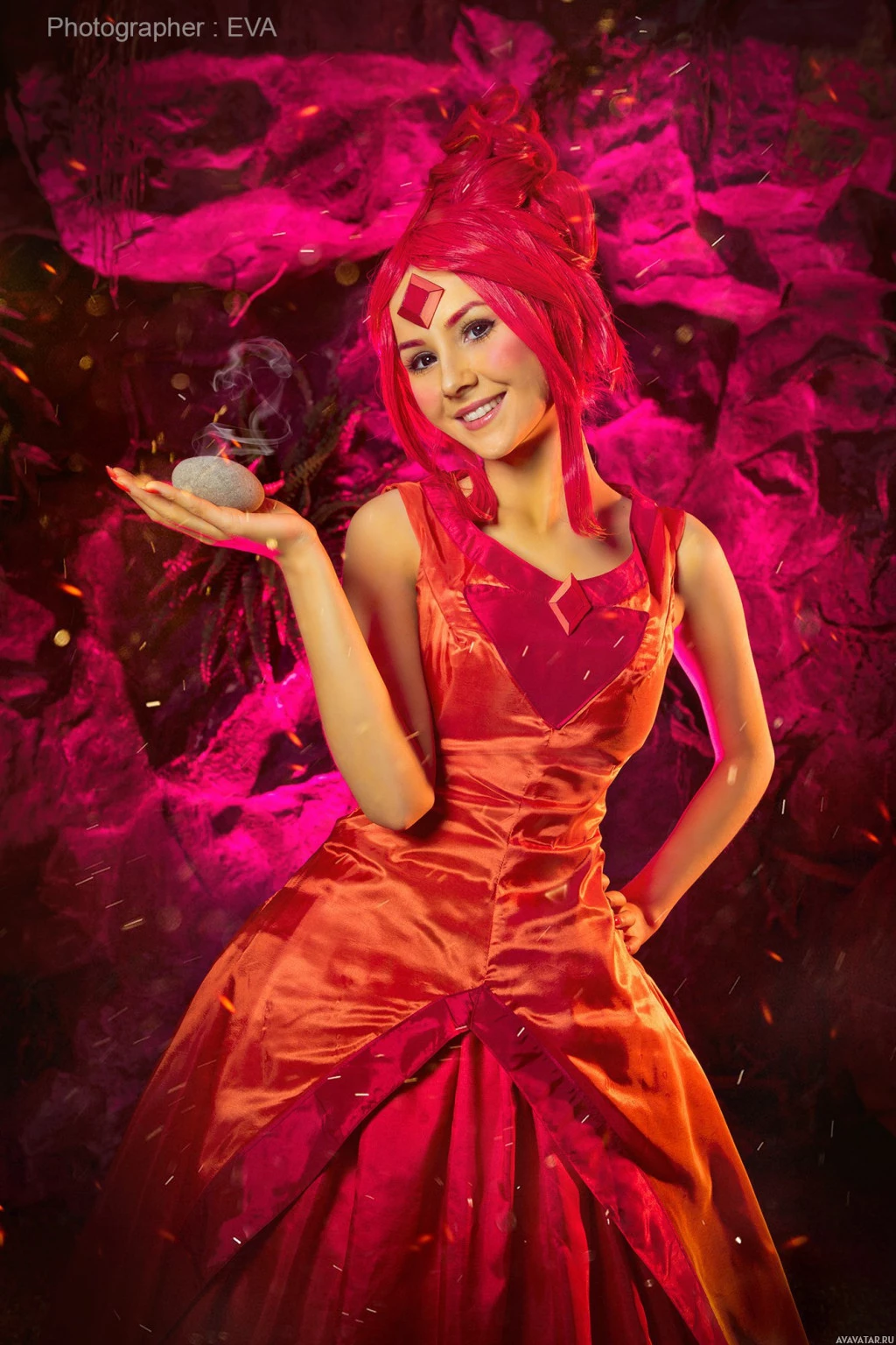 This image features a person dressed in an elaborate costume inspired by Flame Princess from