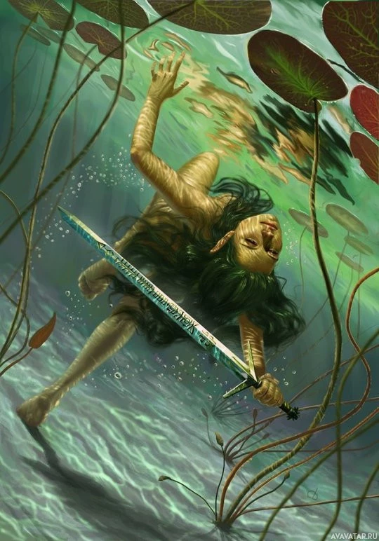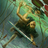 the video game "The Witcher 3: Wild Hunt," known as Ciri. She is shown in an artistic style, holding a sword and appearing to be wading through water among