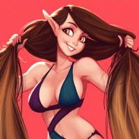 На картинке изображен иллюстрированный персонаж, который кажется эльфом в стиле фэнтези. У нее длинные, текучие волосы и она одета в синий купальник с руками, опирающимися на бедра. Ее поза и выражение лица предполагают уверенное или игривое поведение.