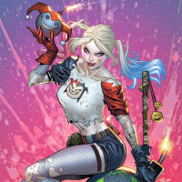 a tank top and fishnet stockings, which is characteristic of her style as Harley Quinn. The background suggests a chaotic and energetic environment that could be fitting for her character.