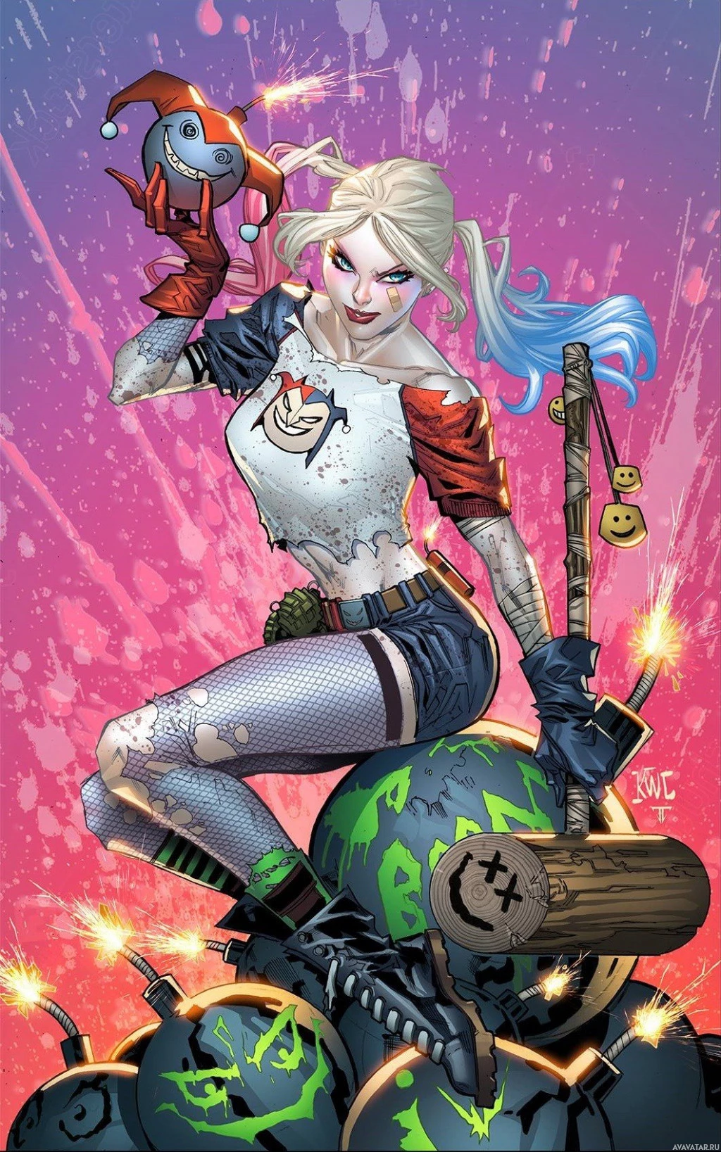 Harley Quinn, a popular comic book villain known for her unstable and erratic behavior. She is depicted in