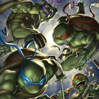colorful costumes, reflecting the style of animation from the various TMNT cartoons over the years. They are shown with