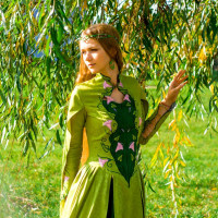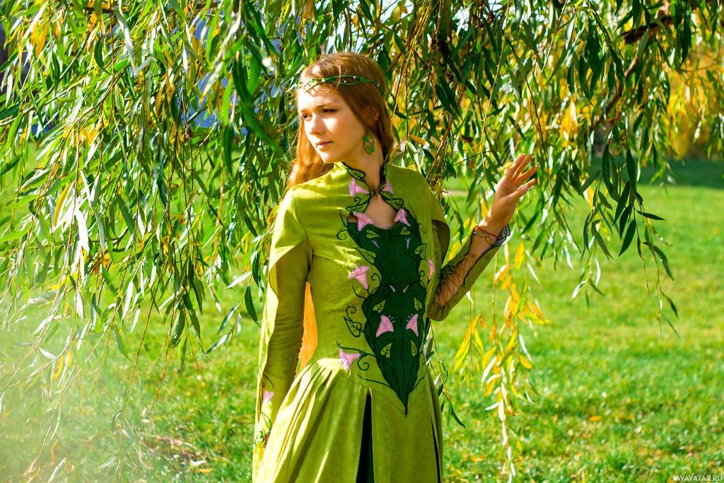 red hair and is wearing a green dress with some sort of pattern on the chest area, which could suggest a specific thematic or costume-like quality to her attire. It's not clear if the dress is meant to represent a particular style or character, but it does give off an impression of being specialized in some way. The setting appears to be outdoors, possibly a park or garden, due to the natural