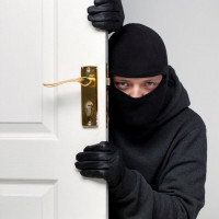 a black mask and holding onto the doorknob of a white door. There is a split-