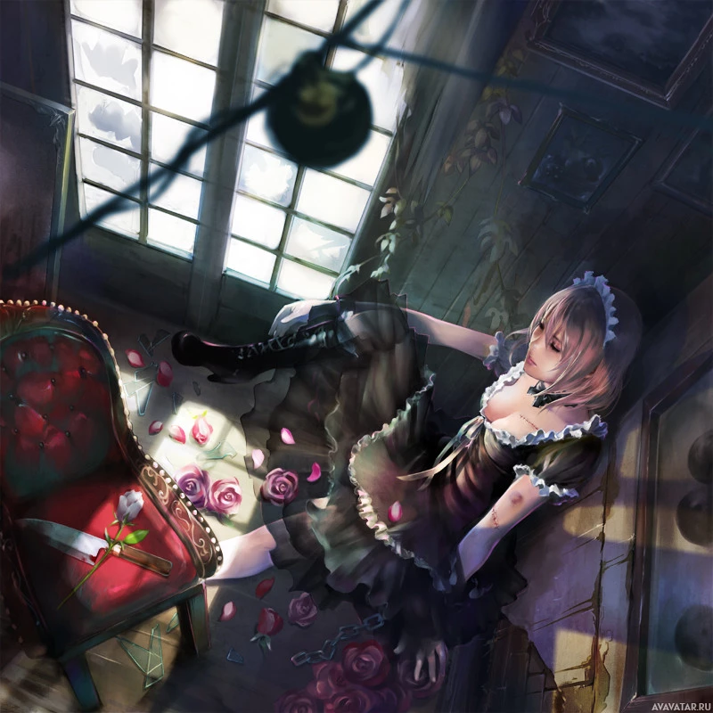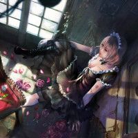 blonde hair, wearing a maid's dress. She is sitting on the floor amidst scattered rose petals, which create a romantic or dramatic atmosphere. The setting suggests a Victorian-style room, possibly in a castle or mansion, given the ornate details and the chandelier visible above her. There are also books nearby, hinting at a scholarly or intellectual interest of the character. The overall style and elements within the image suggest that this is likely from an anime or