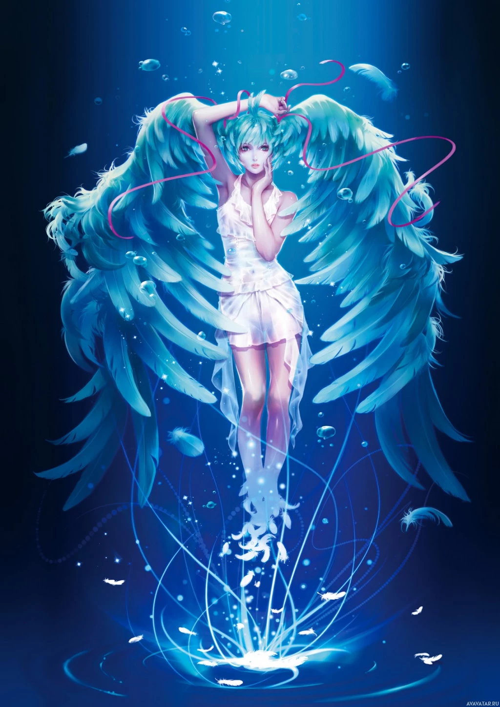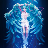 a sense of tranquility or serenity, possibly indicating an underwater setting given the bubbles and flow of water around her. The character's design is detailed, with feathers on the wings and