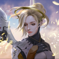 This is an image of a character from the video game Overwatch, known as Mercy. She is depicted in her heroic pose, holding healing beams and with angelic wings sprouting from her back.