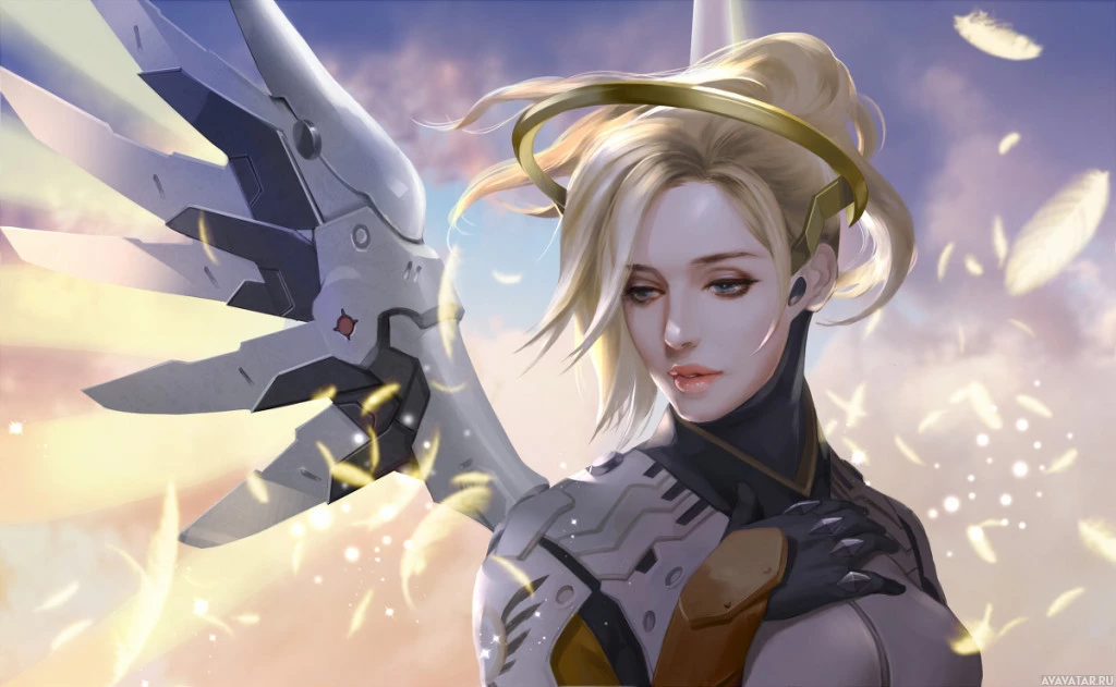Это изображение персонажа из видеоигры Overwatch, известной как Mercy. Она изображена в своей героической позе, держа целебные балки и с ангельскими крыльями, прорастающими из ее спины.