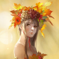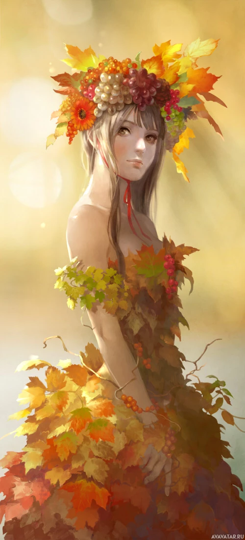 The image shows a character that appears to be inspired by nature themes. The character has berries in her hair, and she is adorned with leaves around her neck, which could suggest she is dressed as a plant or
