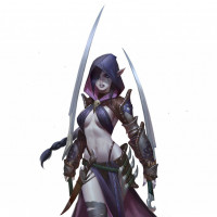pointed ears, slender features, and is dressed in what appears to be armor and carrying a weapon that could be a scimitar or similar type of blade. The character also has magical tattoos on her body, which is common in fantasy artwork to represent