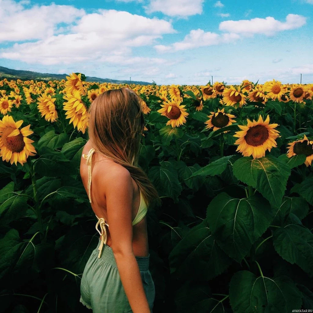 blonde hair and appears to be gazing into the distance, towards the horizon where mountains are visible. The field is lush with bright