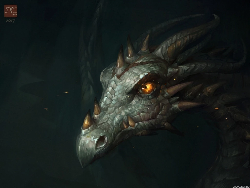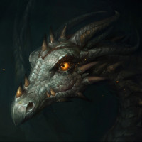 sharp teeth, and eyes with slit pupils, which are characteristic features of a dragon. The dragon is depicted with a somewhat dark or ominous atmosphere, possibly within a cave or underwater setting, indicated by
